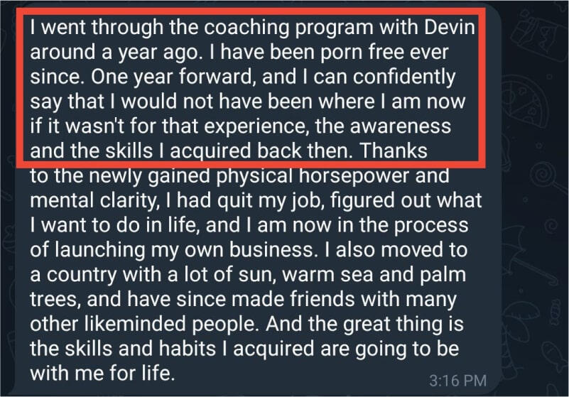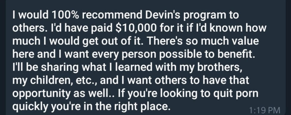 In this short article, you’ll see how you can strengthen your masculine core, quit porn forever, and start living the life of fulfillment you deserve in 60 days or less.No matter how many times you've tried to quit before.Or if you feel hopeless and think you can't.What's been happening to you can be explained with an almond, of all things...(You’ll understand why in just a moment).Read this until the end so you can absorb all the insights I have for you.And don't worry, I get it, I know the internet is full of crazy takes and BS promises.I’ve been in your position, and I know how it feels.My name is Devin McDermott.And I've created a bulletproof process for helping any man kick porn out of his life for good.(Just take a look at these screenshots).