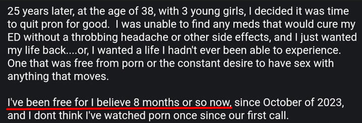Yes, in fact, I personally give you three guarantees:1. If you enroll and follow the Methods (like dozens of men with extreme porn addiction have done before) you will quit.2. If at any point in the future you slip up, then you can schedule a free call with me where we’ll spend as long as we need to get to the root of the problem and make sure it doesn't happen again. You'll have ongoing support even after the initial 60 days.3. What you get will far exceed what you give.And that’s what my clients have said (just look at this screenshot below):
